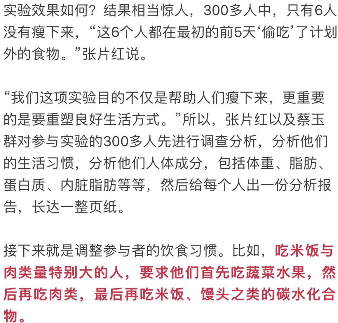 今年8月,国际著名期刊《柳叶刀》发表了一篇论文,指出要健康,就要少吃碳水化合物,多吃脂肪的观点。张片红等牵头设计的减肥方案就是通过“5天以及25天间歇性食疗方法”,把吃碳水化合物放在了进食的最后一环,以达到控制进食这类食物的总量。