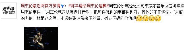 而周杰伦公司杰威尔今响应,称周杰伦就是认真做好音乐,把每件想做的事都做到好,其他的不做评论。