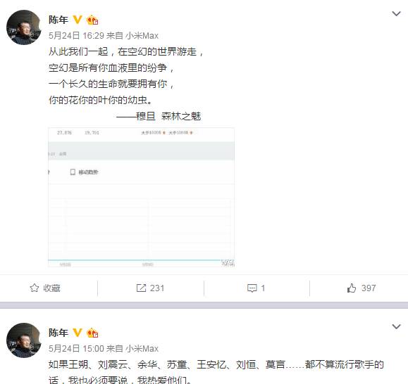 而当天深夜,陈年通过新浪微博发文:“如果罗大佑、崔健、李宗盛、候德健、齐秦、郑智化、窦唯、朴树、伍佰、许巍、宋冬野、达明一派、Beyond……也算流行歌手的话,那么我必须说,我热爱他们。”