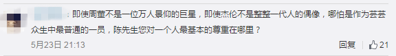 他气愤地表示“无端诋毁周同学是垃圾…其言词令人瞠目结舌”,并无奈地说:“难道在你狭隘且偏激的眼中,流行歌手就不是一项职业?”