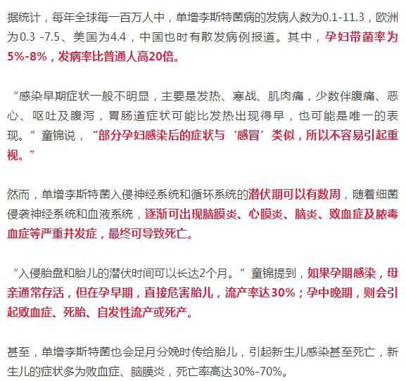 她提到,该菌感染对象主要是患有基础疾病者(如患有慢性淋巴细胞性白血病、骨髓增生障碍、癌症、器官移植、酒精成瘾、肝疾病)、孕女、新生儿以及年龄大于60岁的老人,罹患李斯特菌病的风险比常人高100-1000倍。不过,免疫力正常的健康者很少感染。