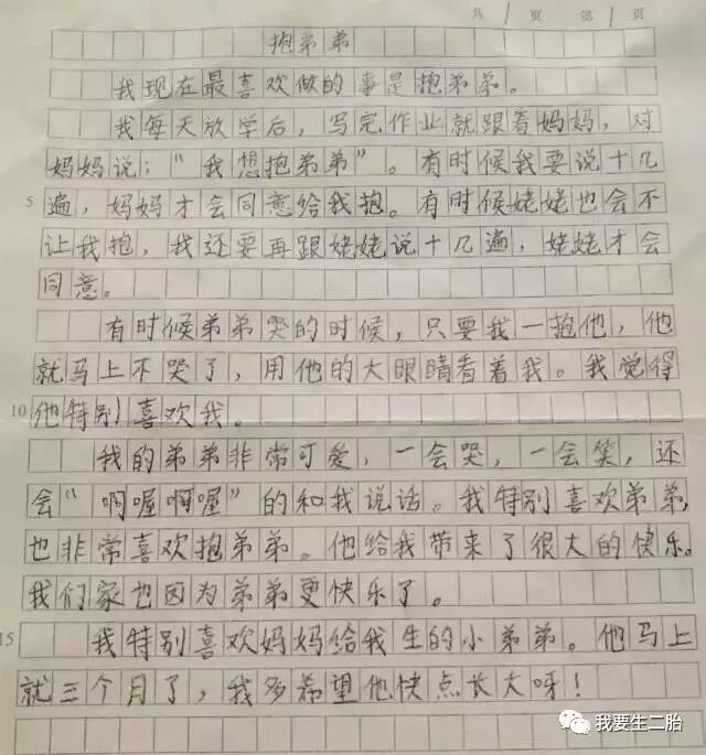 她在作文中写道:“我特别喜欢妈妈给我生的小弟弟!”