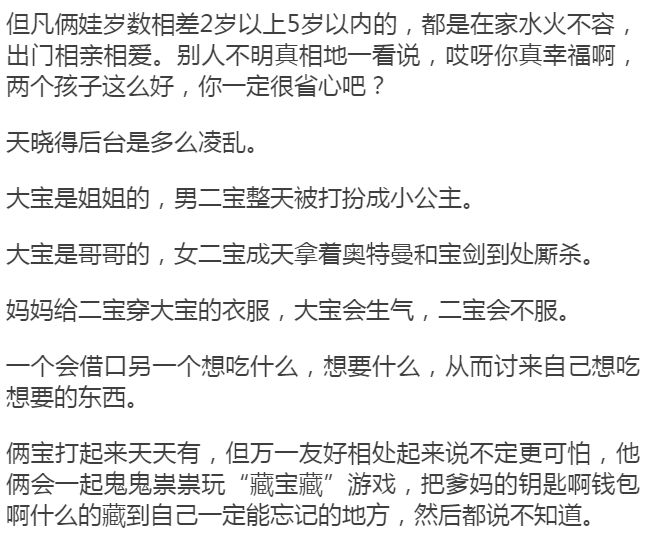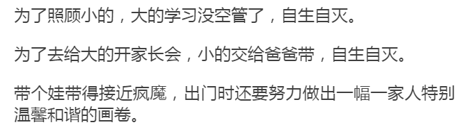 家里一有啥鸡飞狗跳,就赖在主张生二娃的那个人头上。比如大宝生病了全家忙不过来的时候,大宝要送补习班全家人兵荒马乱的时候,大宝把二宝传染了跑一趟医院得三个以上大人跟着得时候,俩孩子打起来一轻伤一重伤的时候……恨不得把二娃塞回肚子去,怀念当时的大娃还是那么得天真无邪可爱纯真,当时的全家人还是那么得从容淡定有条不紊其乐融融……