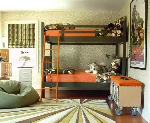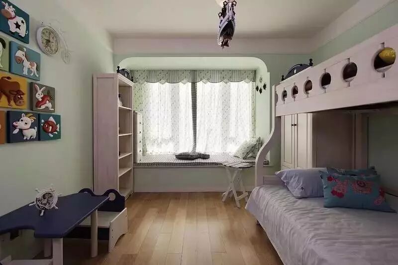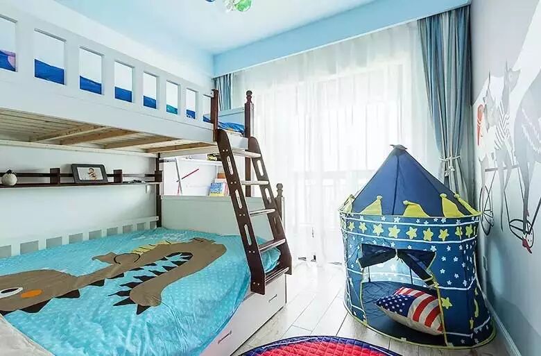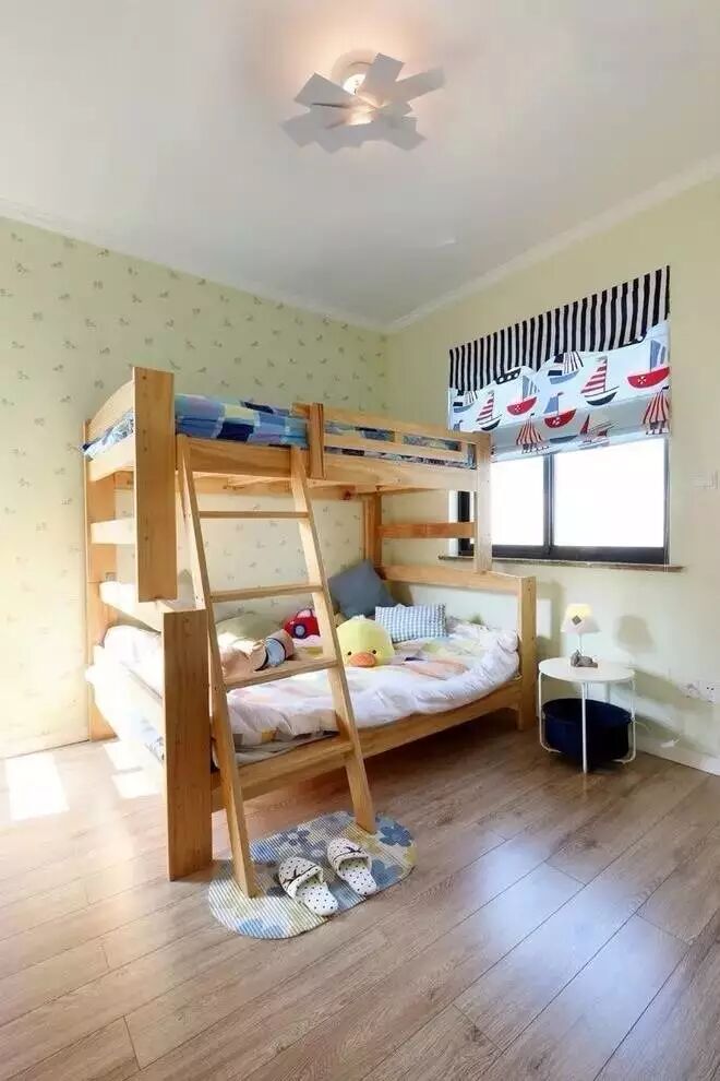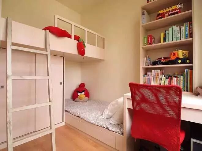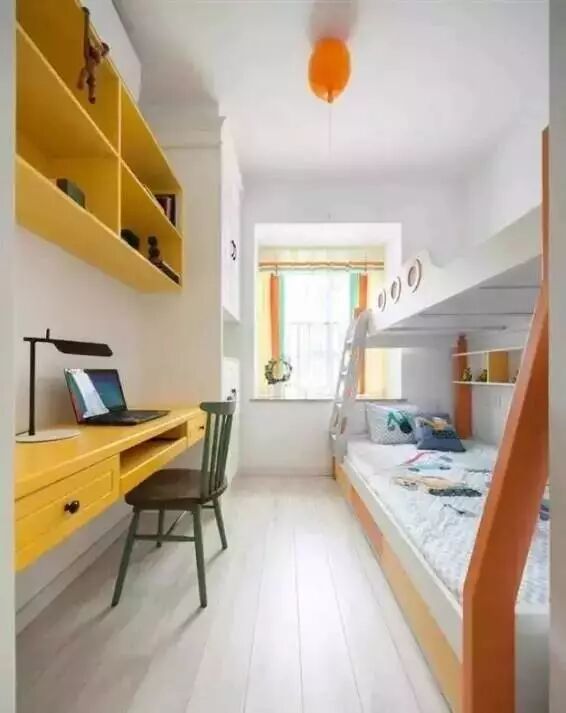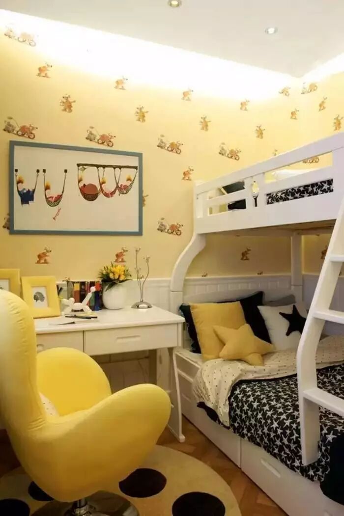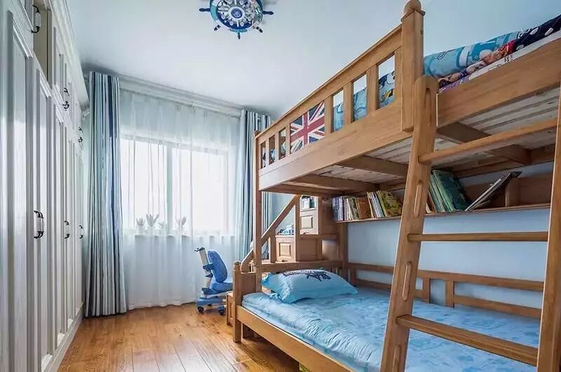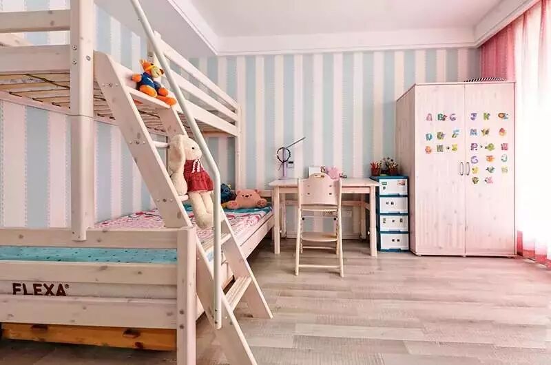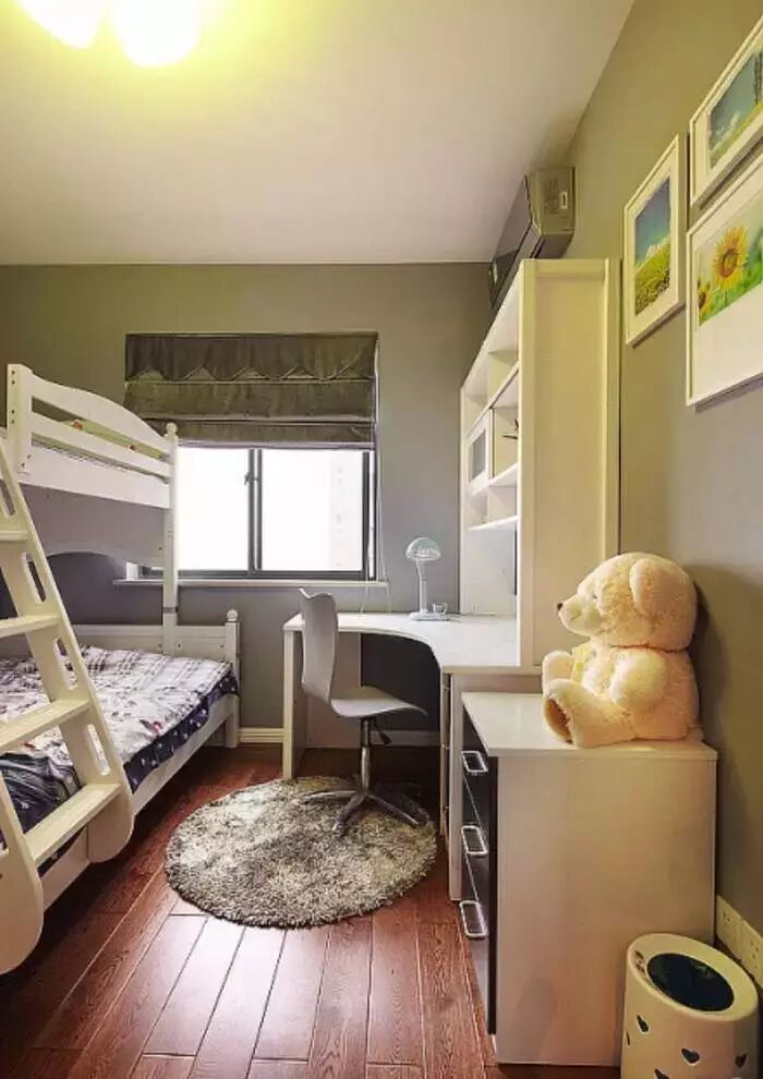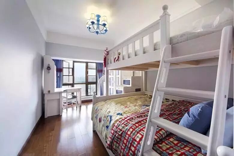 如果你的大宝比二宝大比较多,大宝在6岁以上,可以独立睡上铺,那么上下铺是最适合这样的组合,省出的面积可以作书桌或者游戏区,下面看看案例: