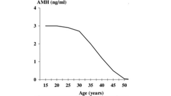 图2 在整个育龄期随着年龄的增长血清AMH平均水平逐渐下降