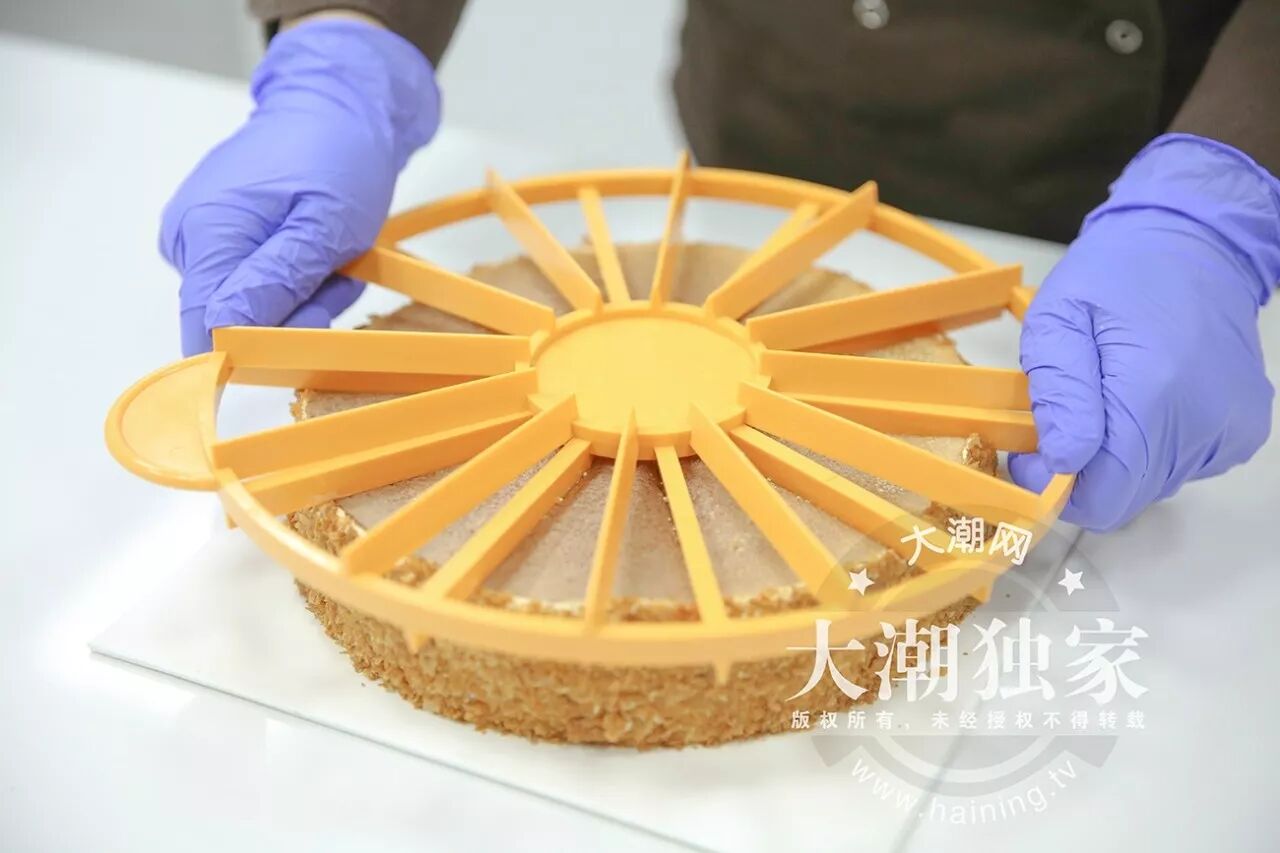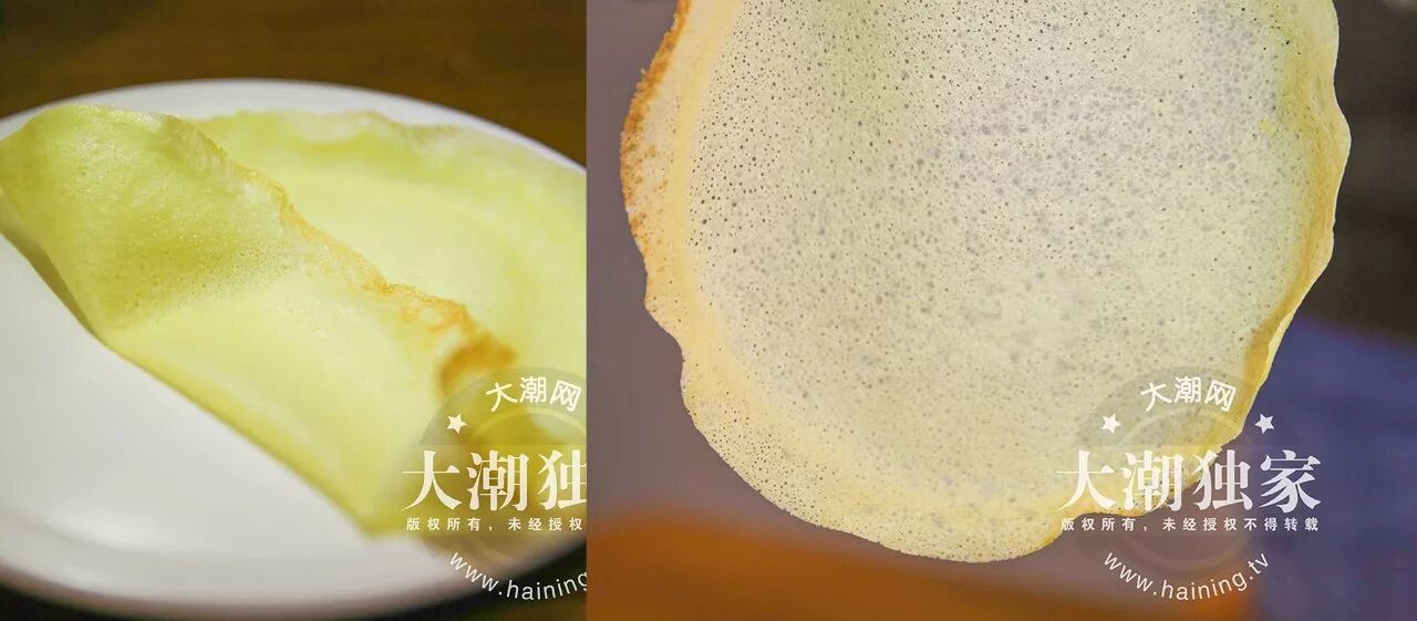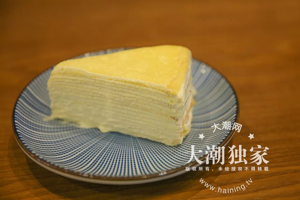说了那么多,咱来看看芳姐的手艺吧,反正大潮君的味蕾已经被俘虏了,用心做的东西,真的很赞。现在一直很火的烘焙,当属千层。芳姐家也做千层,不过她家的千层有些不同。一个就是那层千层皮,看似这是一张简简单单的千层皮,其实它是经过上百次的试验改良过的。大家可以看到这层皮上有很多小孔,皮薄且厚度均匀,大潮君还特地拉了下,很有弹性哦,并不是那种软糯的千层皮,所以她家的千层口感有点Q弹。