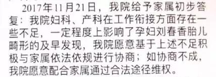 与此同时,院方承认该院妇科、产科在衔接方面存在某些不足,影响了胎儿畸形的及早发现,愿意与家属协商,如协商不成建议走法律程序。