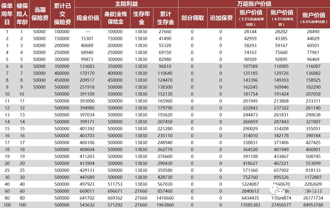 一起看看上面的利益演示表。宝宝20岁时,如果出国深造,将保单变现,可获得主险现金价值+万能账户价值,保底合计413904+418627=约83万元。如果达到6%的结算利率,那么合计约96万元。自产品2015年6月发布至今,实际结算利率一直保持在6.8%以上。这个产品因为太热卖,目前产品方已经对万能账户追加额度进行限制。