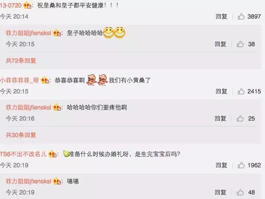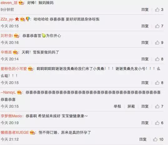 网友纷纷表示:“祝皇桑和皇子都平安健康!”,“恭喜恭喜,我们有小皇桑了~”网友还问:“准备什么时候办婚礼,生完宝宝后吗?”雪梨回复:“嗯嗯。”