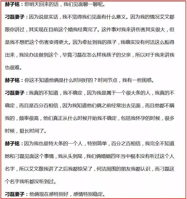 纷纷扰扰了多日的何洁赫子铭离婚大战终于要迎来大结局,今天上午,赫子铭与刁磊妻子的一段通话录音被曝光,也证实了何洁确实插足了刁磊的婚姻,刁磊与第二任妻子2015年11月结婚,妻子是一名普通的白领,结婚不久后怀孕,而在怀孕期间,刁磊多次出门与何洁见面,还不避讳怀孕中的妻子,直到今年8月份,有记者拍到了刁磊陪何洁去医院、看房子的照片,刁磊回家后就和妻子说“我和何洁被拍到了,离婚吧,为了保护你和孩子”,9月7日,刁磊与第二任妻子结束了婚姻,孩子刚刚15个月大。