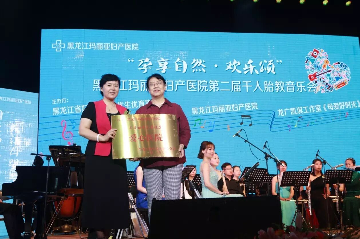 本次胎教音乐会上,为表彰黑龙江玛丽亚妇产医院为促进母婴健康做出的努力和贡献,黑龙江省妇女儿童基金会授予玛丽亚妇产医院“关爱妇女儿童健康-爱心医院”的荣誉称号,黑龙江省妇联副主席白锦婵代表省妇联为玛丽亚颁发牌匾。