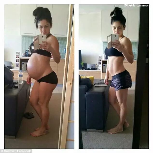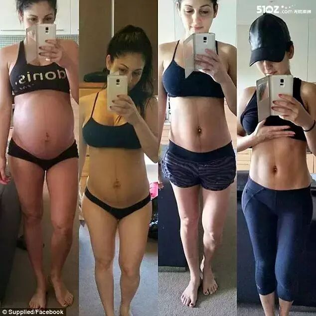 她在产后在Facebook 上传了自己健身恢复的照片,从左到右依次是怀孕41周,产后3天,产后4周,产后6周的照片。