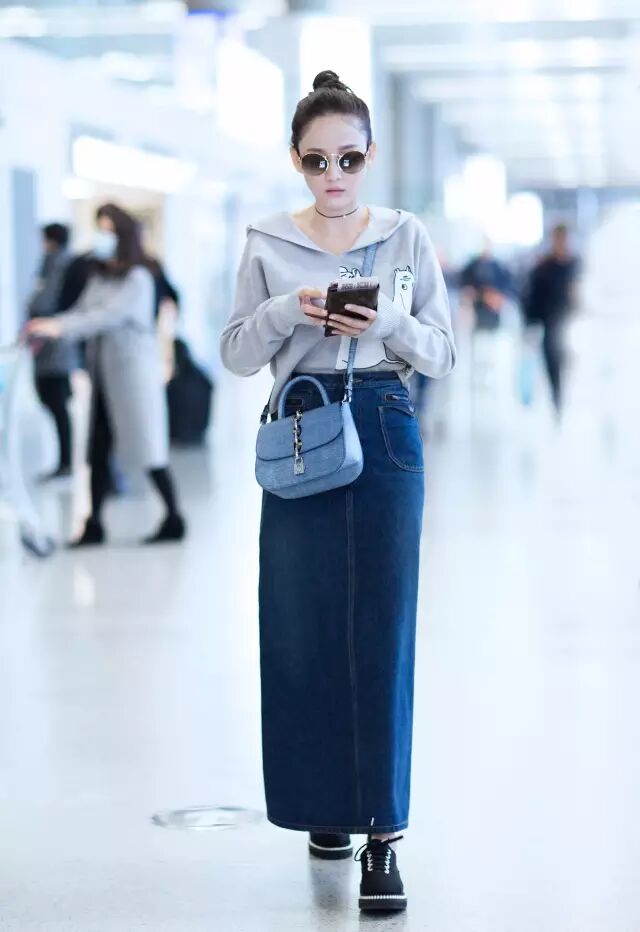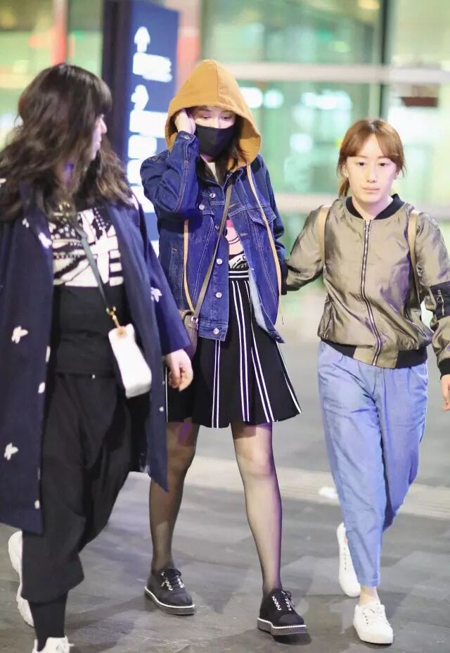 3月21日现身杭州机场,连帽牛仔夹克来自韩火火自创品牌DO NOT TAG,条纹半裙来Chris by Christopher Bu 2017早春,单肩包来自Louis Vuitton “JUNOT”