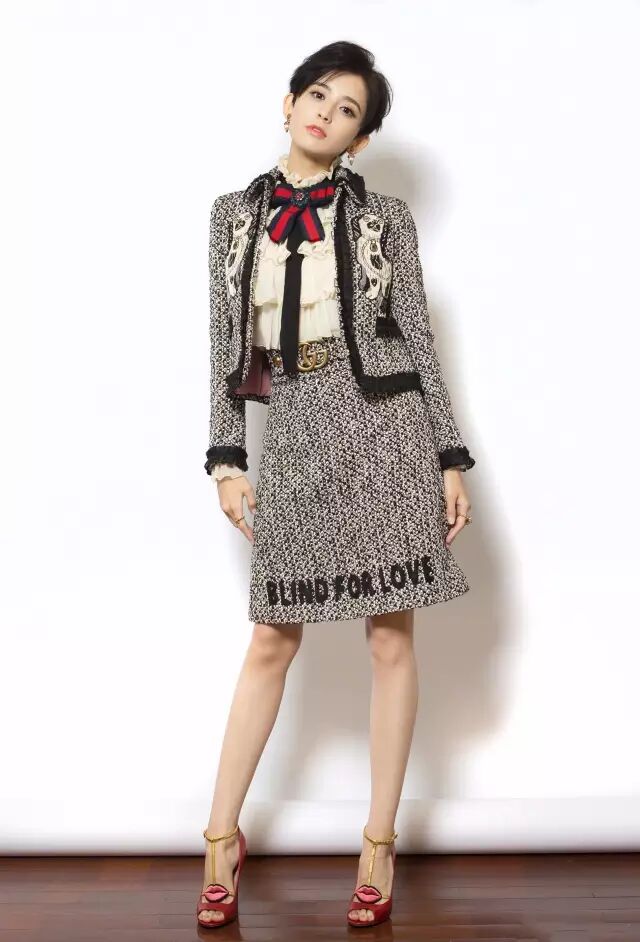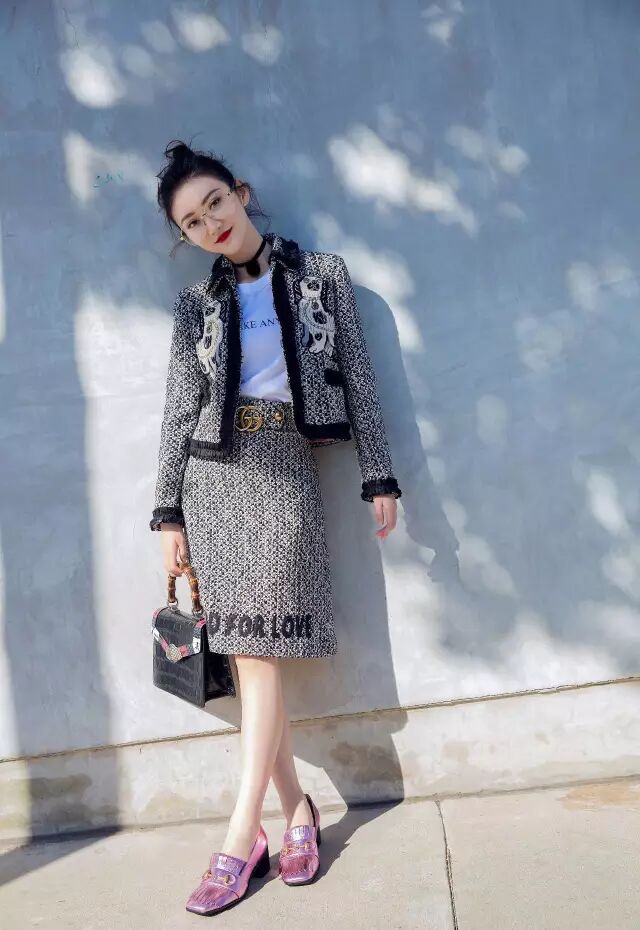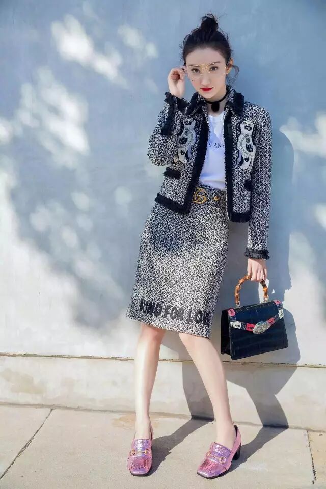 身着Balenciaga 2017春夏系列格纹西装、T恤和半裙,搭配Jimmy Choo银色高跟鞋,出席电视剧粉丝见面会。