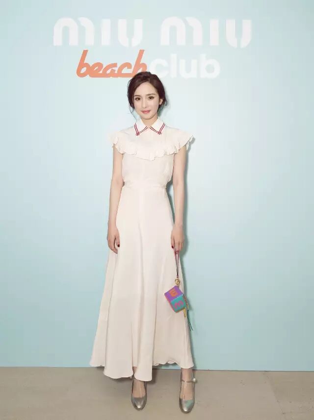 身着Miu Miu 2017早秋系列白色长裙出席在北京举办的Miu Miu海滩俱乐部,拼色小手提包的搭配给整套造型增色不少。