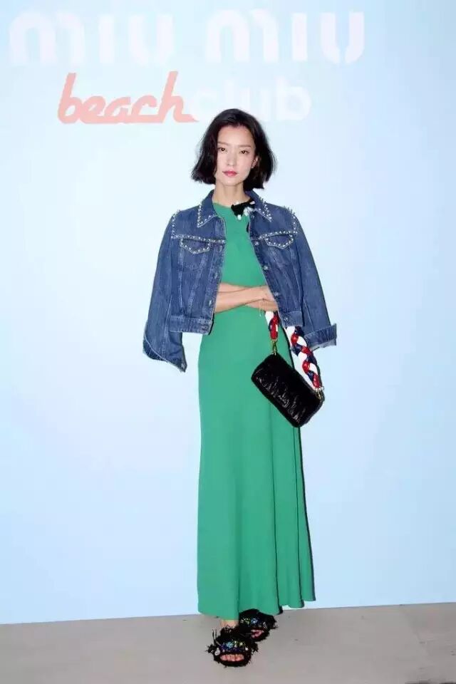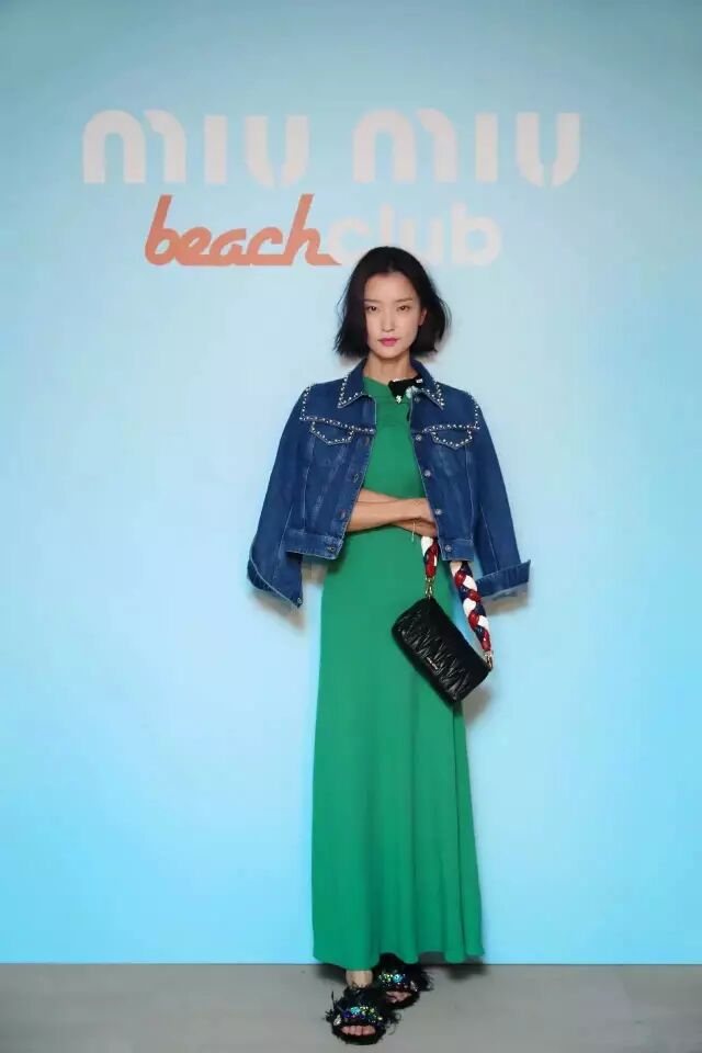 身着Miu Miu 2017早秋系列绿色长裙,外搭牛仔外套出席昨日在北京举办的Miu Miu海滩俱乐部,气质实在是太棒了!