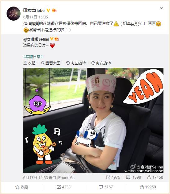 Selina还在微博调侃自己是追星狗,随后Hebe也马上给出了回复!