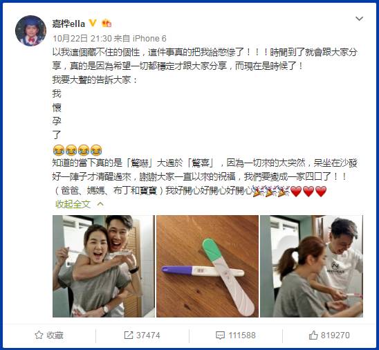 而且Ella的分享形式也非常符合她个性,堪称娱乐圈孕妈的一股泥石流——直接在微博晒出自己的验孕棒!