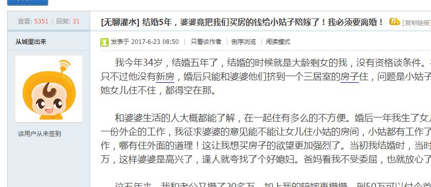 很多热播的婚恋电视剧里,婆媳大战一直是热门话题。而现实中,婆媳相处产生的摩擦,也引发了许多官司纠纷。太灵通论坛也有一个这样的帖子,内容很短,却引发网友的热烈讨论。