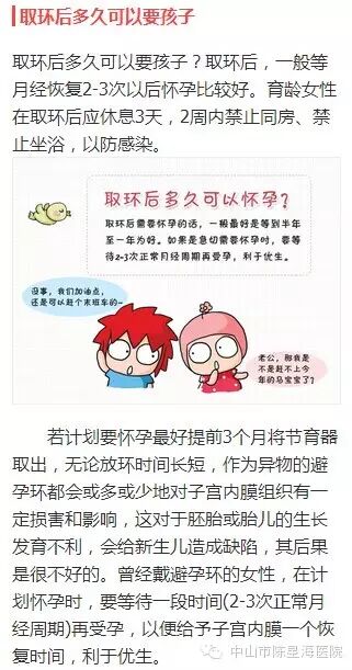 无论放环时间长短,避孕环都会对子宫内膜组织产生一定的损害,取环后等待2-3次正常的月经,让宫腔及子宫内膜修复好再怀孕。