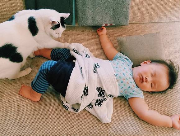 与大多数baby相比,Ty是幸运的,因为迎接他出生的除了爸爸妈妈之外,还有一只奶牛猫。