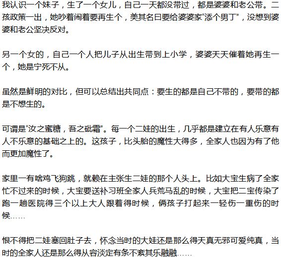 不过好多80后思前想后仔细一琢磨觉得还是不行,造孩子就三分钟的事,养孩子可是扒皮抽筋的事,一个孩子一不留神就把全家从中产砸到贫困人群里了,还把老大也给连累了。