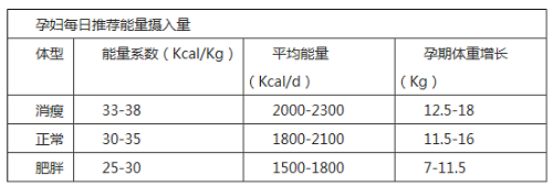 然后,根据体型确定能量系数,一般控制在30-38kcal/Kg,每日饮食总热量=理想体重×能量系数。不同体型孕妇的能量系数及每日推荐能量摄入量见下表: