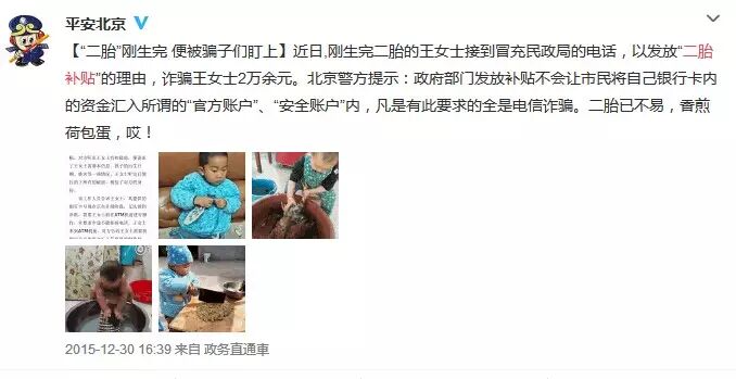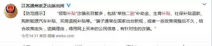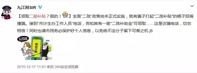 李先生因为谨慎没有上当受骗,但是目前已经有不少地方出现了这样“与时俱进”的骗术。骗子借着国家全面放开“二孩”政策消息红利,打着“二孩”名义进行生育补贴类诈骗。各地警方官微先后发布了相关的骗局: