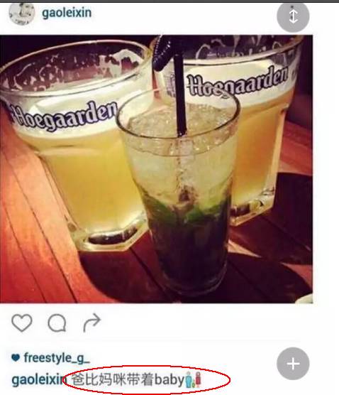 高晒出过大小三杯饮料的照片,配文称爸比妈咪带着baby