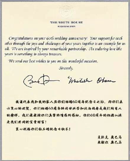 据华西都市报,去年12月,移居美国的王晶给白宫写了一封信,希望奥巴马能够给自己的曾外祖父和曾外祖母送上一份祝福。白宫回信说,总统工作繁忙,可能无法完成这个愿望。原本已不抱希望,没想到1月2日,两位老人的结婚纪念日上,却收到了这份祝福。