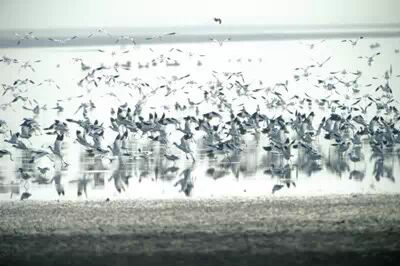 岳阳东洞庭湖大小西湖,一群反嘴鹬栖息在湖面。