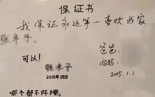 还有报道:2015年元旦,网友“滴答”和丈夫写下《保证书》,向8岁的女儿保证永远第一喜欢她,女儿在保证书上批示“可以”并在纸上写下“哪个都不许擦”,二胎计划才算提上日程。