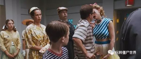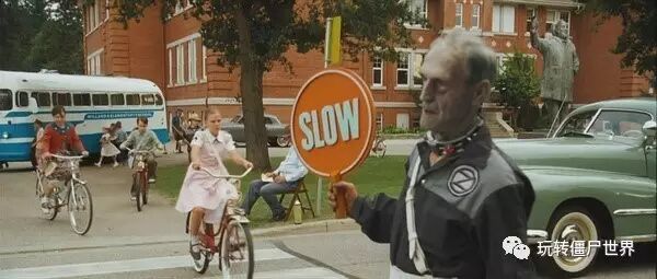 在丧尸横行的世界里导演故意用梦幻般的场景来呈现这个小镇,所有人和景色都是上世界五六十年代的画风,这也是刻意安排的。
