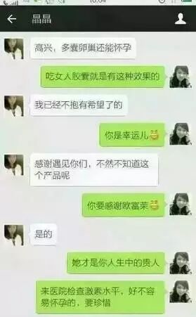 亲爱的亲们,宣布一个好消息,因为吃三清加女人胶囊怀孕的又一例奇迹发生了:一位多囊卵巢综合症的顾客,大家上网查查,不孕症,属于世界性的难题,终身服药,用我们的三清加女人胶囊四个多月,怀孕了!感谢我们伟大的康婷公司,感谢伟大的刘小兵董事长!只要坚持用对产品,终会带给你意想不到的收获!!!