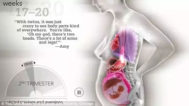 视频展示了从受孕到胎儿出生母亲的变化,器官收到挤压,心脏向左、上、前方移位,胎儿挤压膀胱,出现不适症状。