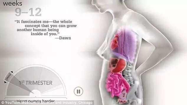 视频展示了从受孕到胎儿出生母亲的变化,器官收到挤压,心脏向左、上、前方移位,胎儿挤压膀胱,出现不适症状。