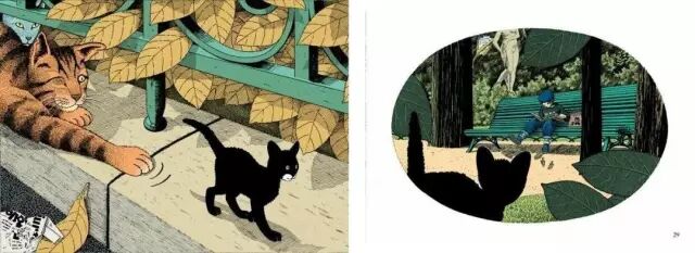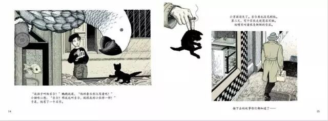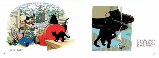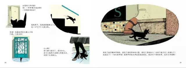 漫画式的场景切换方式,整个绘本线条清晰、设色细腻,准确生动的描绘出了小黑猫从烦恼、失落到打起精神、神采奕奕的心理过程。