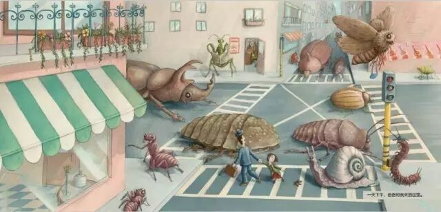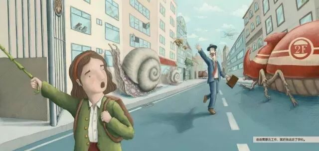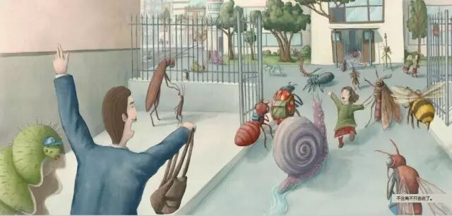 这是一个被成人强行带入新生活的女孩,略显成熟的面孔上似乎没有了孩子的天真,父亲的手拉着她进入了一个陌生又可怕的城市,女孩子的过去就像地上的毛绒小熊一样被丢在了不远处。她对陌生环境的心理排斥显现在画面上,把看到的一切变为了内心厌恶的昆虫。她走过昆虫的街道,和虫子们一起上学,尽管友善的虫子们拿出手工哄她开心,但是她仍旧无法融入这个新世界。女孩内心的渺小感从大操场、高铁门的对比中,比人还巨大的昆虫更是无处不在,压迫着孩子的内心。这本绘本画出了孩子内心不为父母所知的孤独与拒绝。