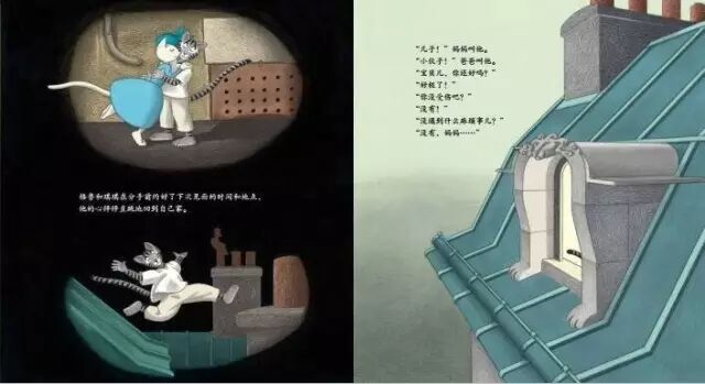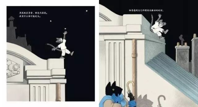 我们都是这么长大的——孩子们也会是这样,如同故事里的小猫格鲁——被内心深处神秘的冲动召唤,越过天窗(或以别的不同寻常的方式),独自一个走进无边的夜的世界。黑夜,意味着未知、冒险和更广阔、更有趣的生活;独自一个,意味着自在、专注和更细腻、更深切的体验。如果不是独自一个,格鲁也许会享受与别人相处的快乐,也许会过分在意自己的表现,那就可能注意不到“并不是所有的猫都是灰色的”,以及“夜里,猫咪们有的在睡觉,有的在看书,有的在散步,有的与爱人在一起……还有的在聚会”这些丰富的细节。当然,独自一个难免会有恐惧,还得战胜可怕的阴影,但这也增添了“发现善良的小东西”的快乐。更了不起的是,经历一夜的独自出行,格鲁学会了应对外来的迫害,获得了对幸福的认识,以及爱的能力。