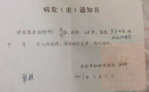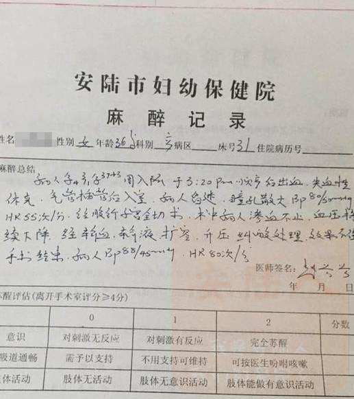 2月13日,安陆市妇幼保健院记录关于先女士的《手术安全核查表》以及《麻醉记录》显示,先女士于2月13日下午3时20分顺产后出血,失血性休克,病人昏迷,瞳孔散大。经子宫全切术,术中病人渗血不止。安陆市妇幼保健院2月13日下达的《病危(重)通知书》显示,先女士“产后出血、失血性休克”,病情危重。