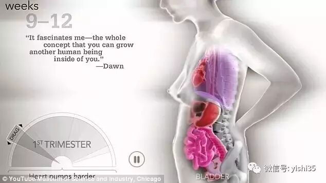 视频展示了从受孕到胎儿出生母亲的变化,器官收到挤压,心脏向左、上、前方移位,胎儿挤压膀胱,出现不适症状。