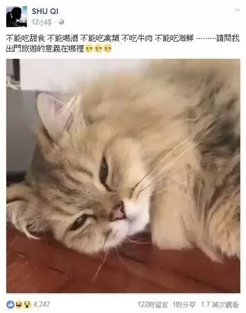 6日舒淇在脸书发文,抱怨自己现在不能吃甜食、喝酒、禽类、牛肉、海鲜,还试问所有网友“这样出门旅游的意义在哪里”,完全流露出无奈心情。