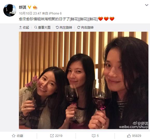 10日,舒淇在微博上贴出和姊妹淘林心如、林熙蕾的合照,手里拿着红酒杯。接着她在脸书发图配文并留言道“……的日子”,和粉丝大玩填空游戏,而其中闺蜜徐若瑄则回应“不能拿酒杯的日子”。
