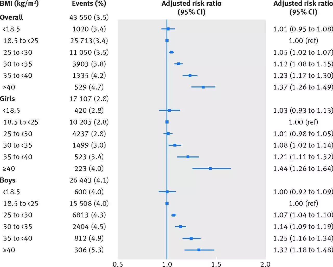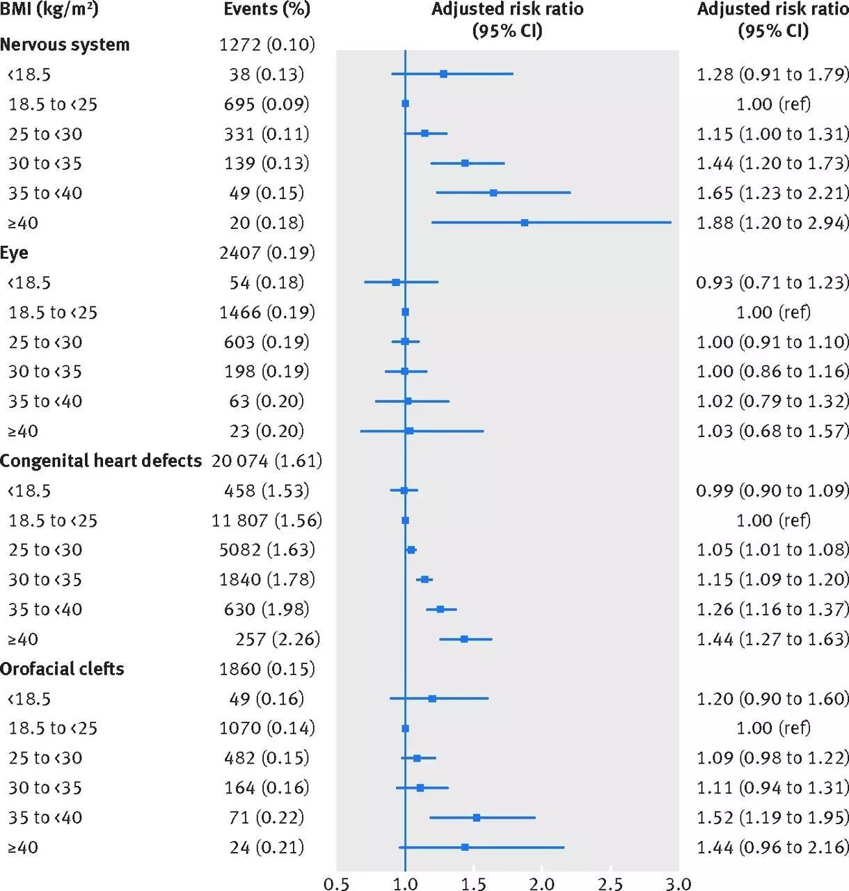 正常体重母亲的后代患畸形的风险为3.4%。在排除母亲其他因素、后代性别和出生年份的影响后,超重(体重指数BMI 25~30)母亲的后代患有任何重大先天性畸形的风险比正常母亲后代升高了5%;I级肥胖(BMI 30~35)母亲后代的风险升高了12%,II级肥胖(BMI 35~40)者升高23%,III级肥胖(BMI大于40)者升高37%。
