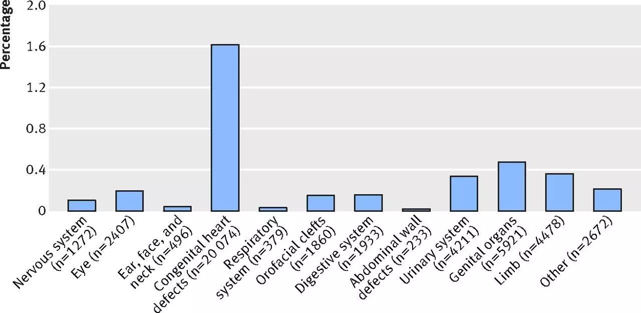 研究结果显示,在观察到的所有新生儿中,患有任何重大先天性畸形的共有4.3万例(3.5%),其中最常见的是先天性心脏病,占将近一半,有2万多例(1.6%)。