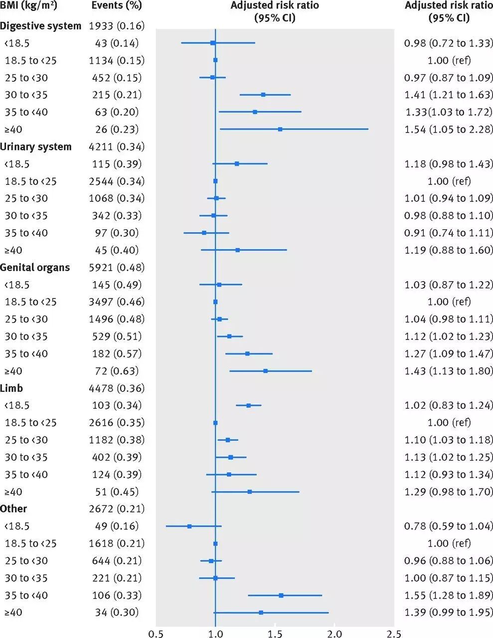 在各种畸形中,先天性心脏病、神经系统畸形和肢体缺陷的风险也随着BMI从超重到III级肥胖而逐步升高。与母亲超重和肥胖相关的器官特异性相对风险最高的是神经系统畸形。在肥胖母亲的后代中,生殖和消化系统的畸形也增加。