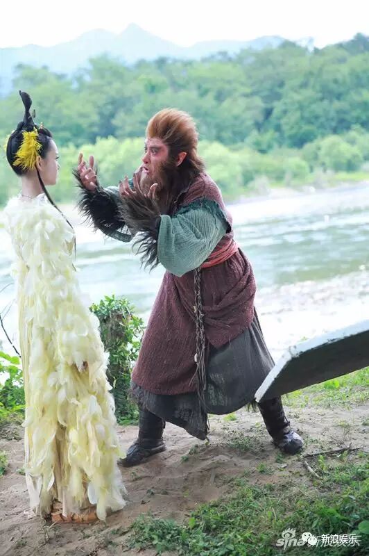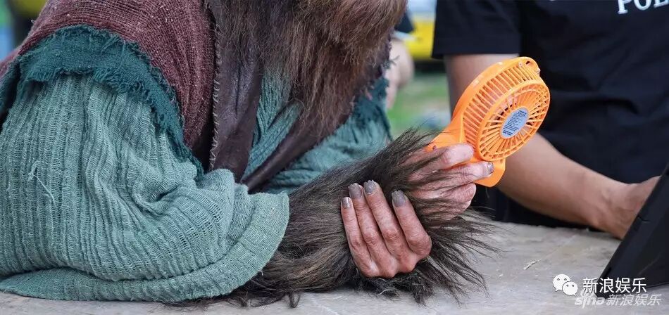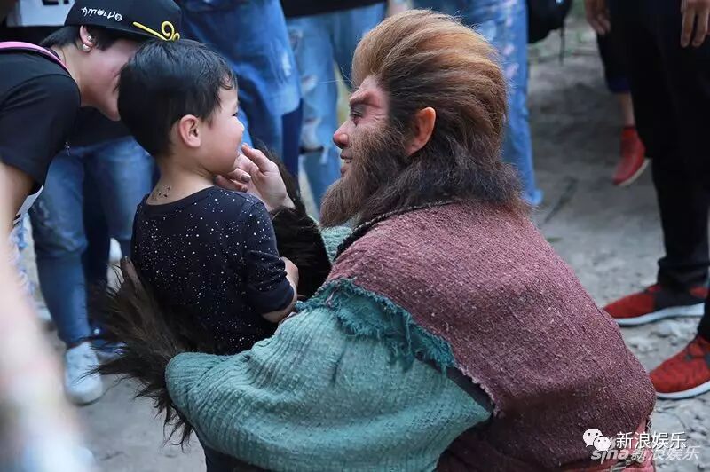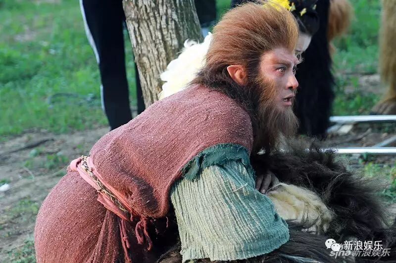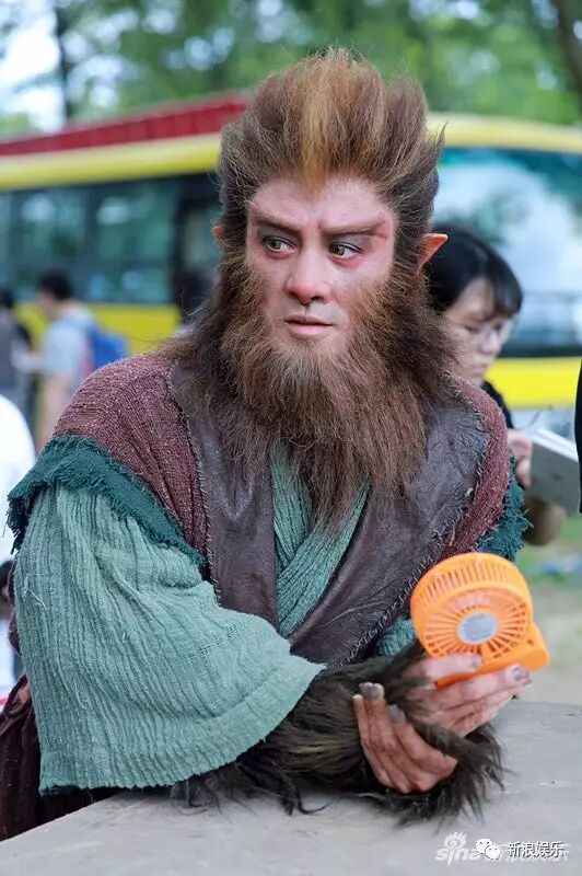 一身厚重猴毛,绿色长袍外再套一件红色外褂,再加上脸部特效化妆,原来这只猴子是林峰