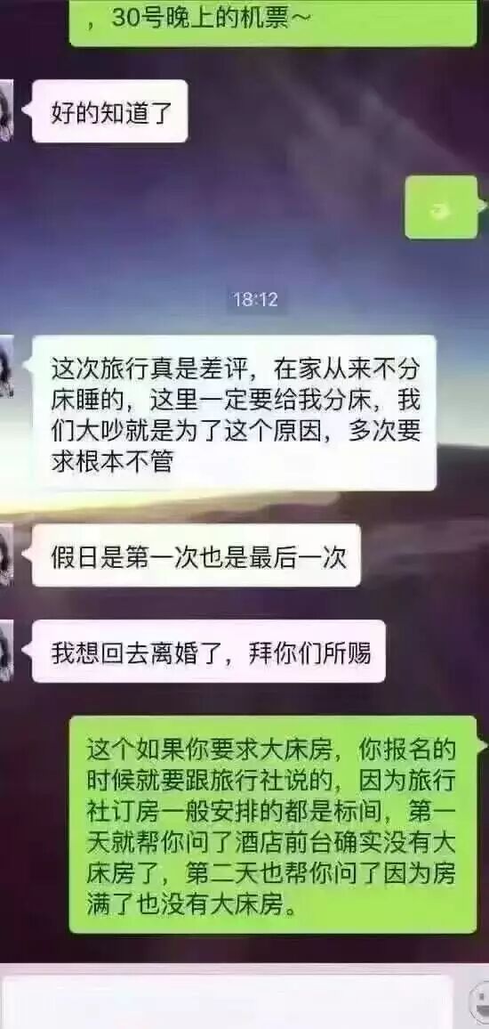 没分大床就闹离婚了,都怪旅行社,人家感情那么好,你给人家分床干嘛?都怪导游,就因为这一晚上没抱在一起,就离婚了。。。。