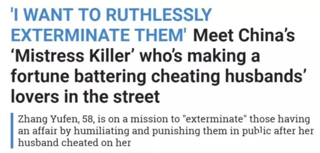 此前,美媒也报道过中国的“二奶杀手”('Mistress Killer'),58岁女子张玉芬。