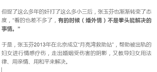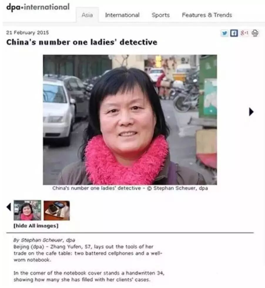 张玉芬因丈夫出轨,于2003年创办全国首家专抓小三的女侦探社,帮助已婚妇女侦查丈夫外遇,并提供捉奸服务,她称至今已有20万人向她求助。
